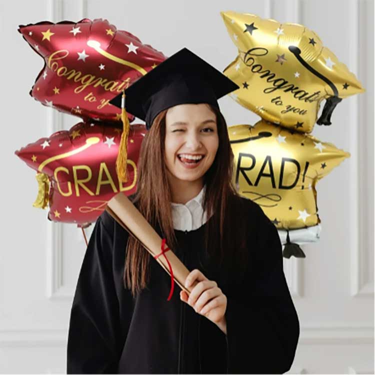 32 tuuman Graduation Cap -ilmapallosarjamme on valmistettu 18 mikronin paksuisesta korkealaatuisesta aluminoidusta PET-kalvosta. Tällä kalvolla on erinomainen elastisuus, se täyttyy täysin ja pehmeästi, ja se kestää puristusta ja iskuja – täydellinen kouluihin ja vastaaviin tiloihin. Käytämme tulostukseen ympäristöystävällisiä musteita, joiden tuloksena saadaan eloisia, tasaisia värejä, jotka kestävät haalistumista. Jopa tuntien suoralle auringonvalolle altistumisen jälkeen, kuten ulkona valmistuneissa valmistumisseremonioissa, kuviot ja värit pysyvät yhtä eloisina kuin koskaan.