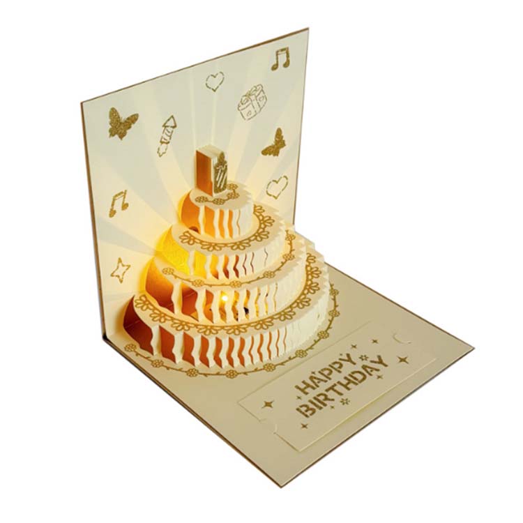 3D -syntymäpäiväkortin kansi on valmistettu värillisellä kohokuviointiprosessilla. Sen sisustuksessa on 4-kerroksisen kakun suunnittelu, ja onnitteluviestille lisätään pieni tervehdyskortti.
