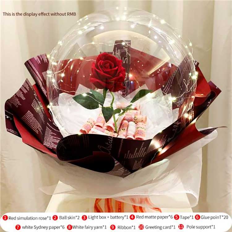 BOBO-ilmapalloon uskomattoman tunnelmallinen:Läpinäkyviä BOBO-ilmapalloja, upotettuja ruusuja ja LED-valoja sisältävä setti luo kirkkaan ja romanttisen visuaalisen vaikutelman. LED-valot tarjoavat myös pehmeää hehkua, joten se on tärkeä lahja ystävänpäivänä, vuosipäivinä, syntymäpäivinä, valmistujaisissa ja äitienpäivänä.