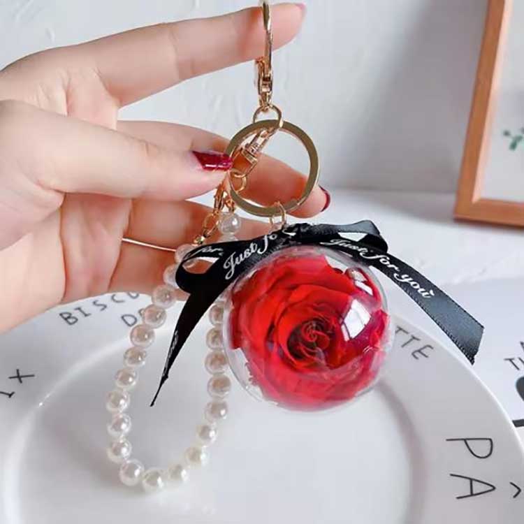New Shine's Eternal Flower Keychain -avaimenperässä on pyöreä, läpinäkyvä akryylipallokoristelu, joka suojaa säilytettyä kukkaa paremmin ja helpottaa sen säilyttämistä. Sen päärunko on halkaisijaltaan tasan 5 cm ja painaa noin 32,5 grammaa. Se on kämmenen kokoinen, ei koottava avaimiin ripustettuna, eikä se näytä väärältä laukussa. Saatavilla useita värejä.