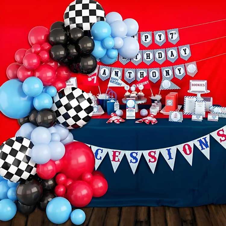 Kilpateemainen ilmapallokaaren koristelusarja on koristeellinen ratkaisu, joka on suunniteltu erityisesti kilpa-aiheisiin juhliin, tapahtumiin ja syntymäpäiväjuhliin. Tämä tuote on keskittynyt autourheilun teemaan. Lisäämällä mustia, hopeisia, sinisiä ja punaisia lateksiilmapalloja sekä automalleja ja kilpatarvikkeita, se saa lopputuloksena koristeeksi kaaren muodon, joka luo tapahtumapaikalle intohimoisen ja iloisen tunnelman.