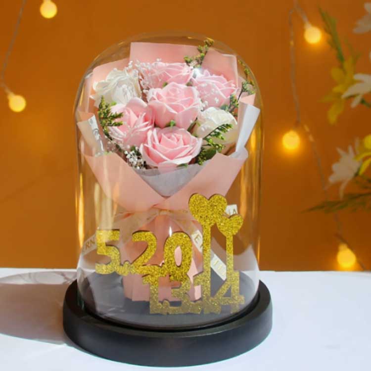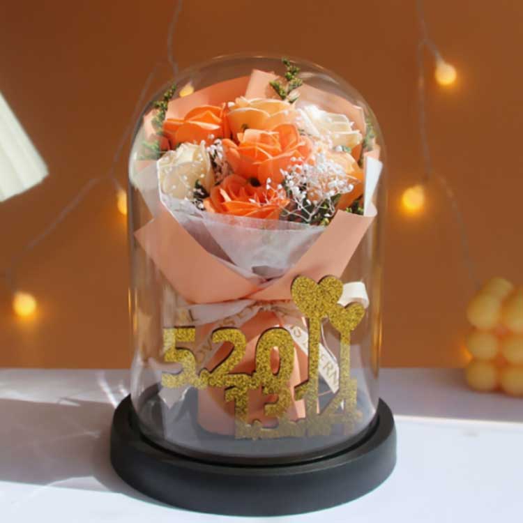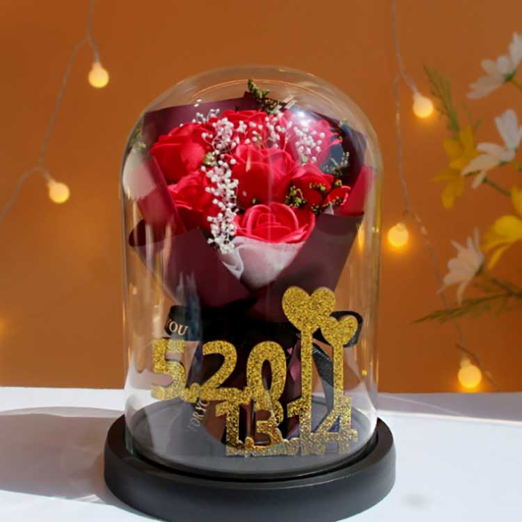 Tämä lasinen ruusukimppu on suunniteltu estämään kukkien kuihtumista, eivätkä sisällä olevat ruusut haalistu. Kimppu on hyvin todentuntuinen, melkein erottuva aidoista kukista, ja se pystyy esittelemään kimpun kauneuden erittäin hyvin. Sisällä kultaiset numerot 520+1314 edustavat numeroita 520 ja 1314, jotka symboloivat rakkautta ja korostavat lahjan ajattelua.